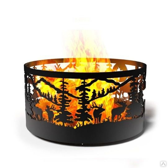 Очаг для костра «Закат в горах». Костровой очаг для разведения огня на приусадебном участке с силуэтами гор и диких животных.