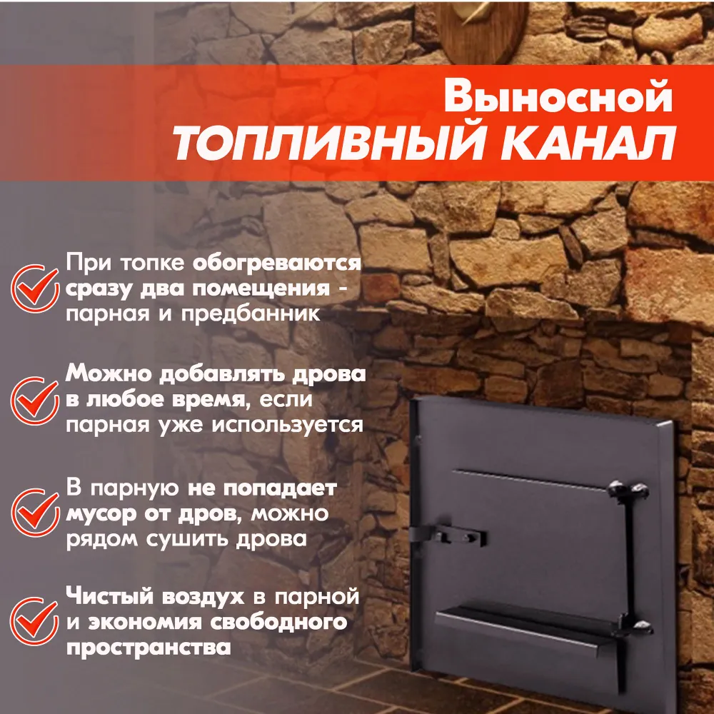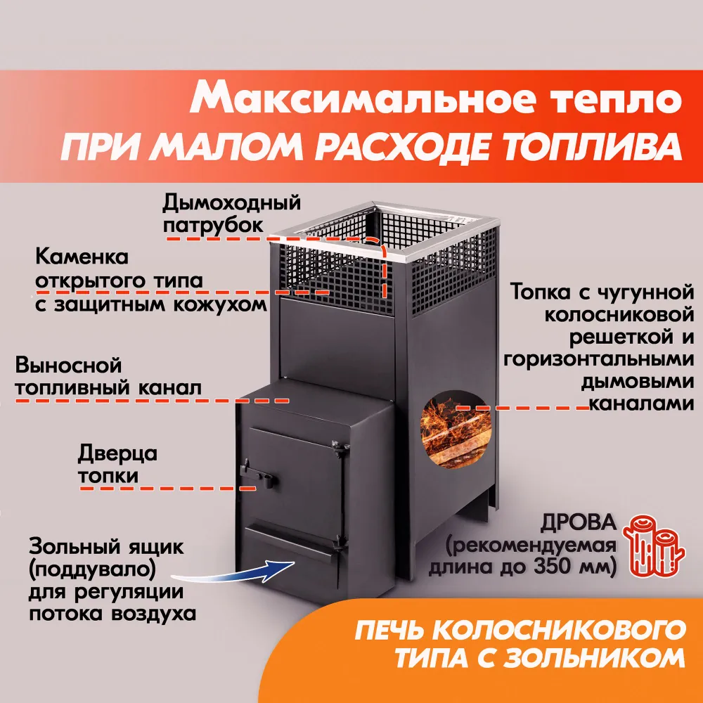 Несмотря на весьма небольшие размеры дровяной печи для бани, горизонтальные дымовые каналы обеспечивают высокую равномерную теплоотдачу, делая данную банную печь очень экономичным вариантом, так как при небольшом количестве топлива достигается максимальное выделение тепла.