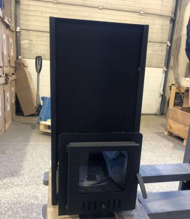 Удобная топочная дверца дровяной печи для бани с панорамным стеклом позволяет наблюдать за процессом горения и визуально контролировать закладку дров и степень сгорания топлива.