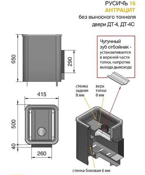 Дровяная печь для бани Русичъ предназначена и разработана для отопления парильных помещений, получения пара, а также нагрева воды. Объемная, вентилируемая каменка позволяет максимально быстро нагреть камни с четырёх сторон в кратчайшие сроки. Большая масса камней (до 40 кг!), закладываемая в каменку печи, нагревается до 350 °С, что позволяет обеспечить стабильность температуры в парилке и является мощным парогенератором. Поверхность нагрева печи охвачена сверхъемким наружным конвекционно-вентилируемым кожухом-конвектором, что значительно ускоряет нагревание воздуха в парилке за счёт образуемого им мощного конвекционного потока. Топка печи выполнена из специальной конструкционной стали толщиной до 12 мм. Сталь благодаря своей устойчивости к высоким температурам не подвергается деформации. Топочная дверца изготовлена из высококачественного чугуна. Длинная колосниковая решётка из массивного литейного чугуна, обеспечивает равномерное горение дров, столь необходимое для банной печи. Выдвижной зольный ящик позволяет удалить накопившуюся золу, не прерывая горения и эффективно регулировать его интенсивность. Все эти характеристики позволяют утверждать, что эту модель можно считать самой скоростной печкой по прогреву парильного помещения. Печь ТМ Везувий Русичъ имеет сертификат Госстандарта России, санитарно-эпидемиологическое заключение, сертификат пожарной безопасности и соответствует требованиям пожарной безопасности (НПБ 252-98). Банная печь Русичъ С укомплектована чугунной дверцей с жаропрочным стеклом. Дровяная печь Везувий Русичъ 16 С рассчитана на объем парильного помещения 8-16 м3. В конструкции данной печи не предусмотрен топочный тоннель, что позволяет топить её прямо из парильного помещения.