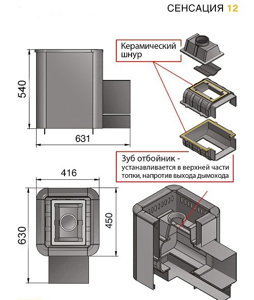 Преимущество печи «Сенсация» объемная, вентилируемая каменка позволяющая максимально быстро нагреть камни с четырёх сторон в кратчайшие сроки. Большая масса камней, закладываемая в каменку печи, нагревается до 350 °С, что позволяет обеспечить стабильность температуры в парилке и является мощным парогенератором. Поверхность нагрева печи охвачена сверхъемким наружным конвекционно-вентилируемым кожухом , что значительно ускоряет нагревание воздуха в парилке за счёт образуемого им мощного конвекционного потока. Гарантия 30 лет.