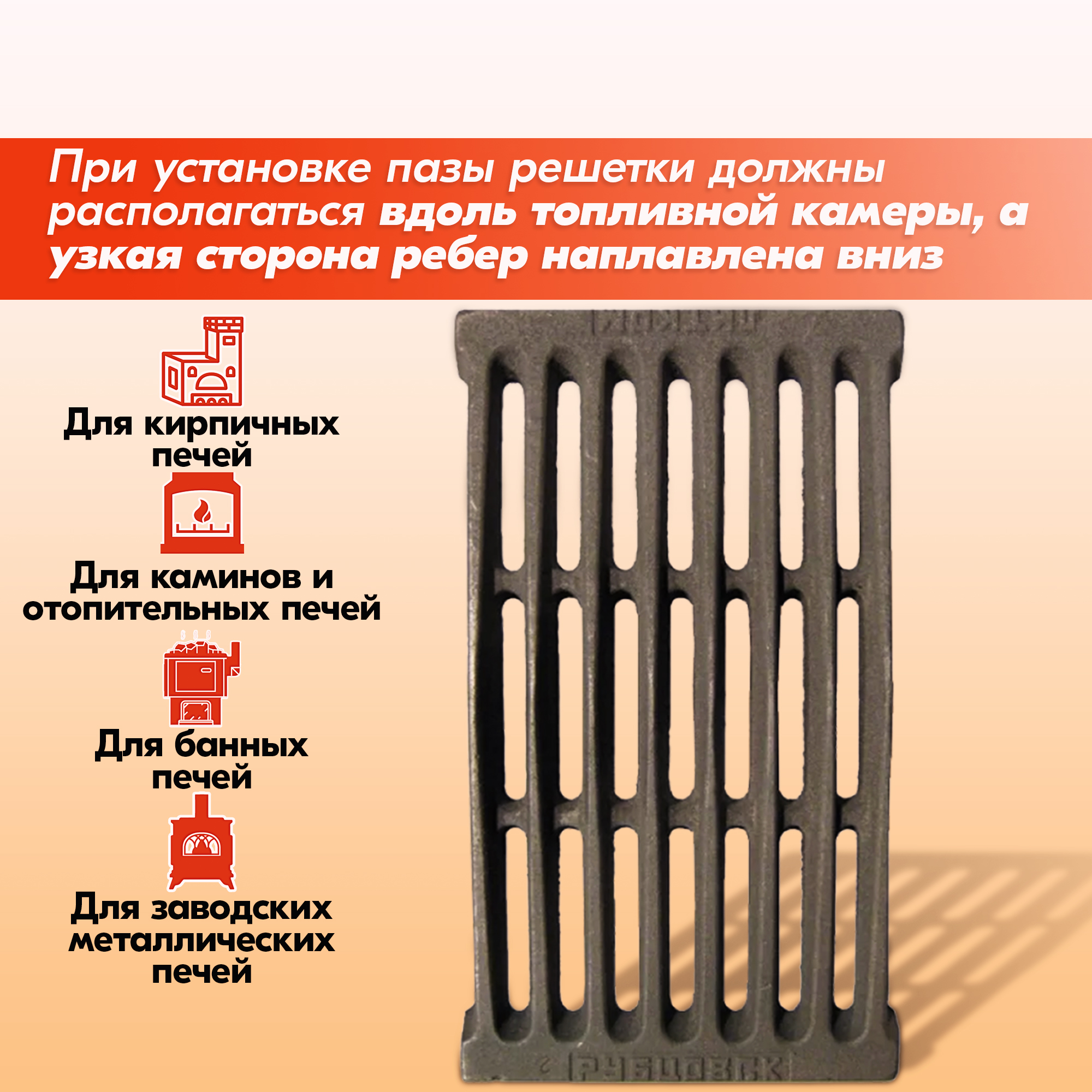 Располагать решетку колосниковую в топке обязательно узкой стороной ребер вниз, иначе срок её службы значительно снижается.